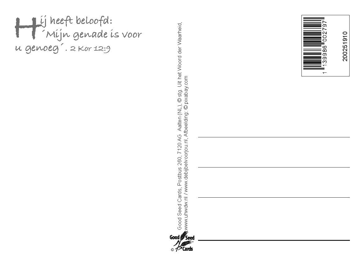achterkant: Hij heeft beloofd: 'Mijn genade is voor u genoeg'. 2 Kor. 12:9