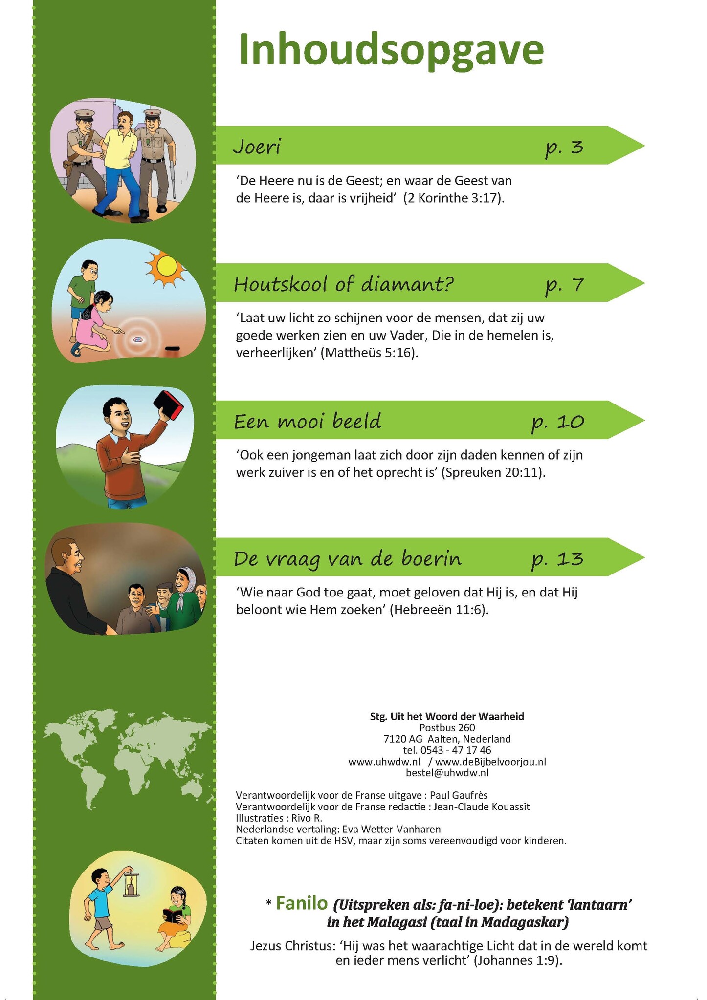 Deze fraai vormgegeven brochure is uitermate geschikt om in het evangelie door te geven aan kinderen, ook in een multiculturele omgeving. De serie ‘Fanilo’ is ontworpen in Madagaskar en geeft in verhalende vorm het goede nieuws van redding door Jezus Christus op een begrijpelijke manier door aan kinderen. Met kleurplaten en Bijbelteksten om evt. uit het hoofd te leren.