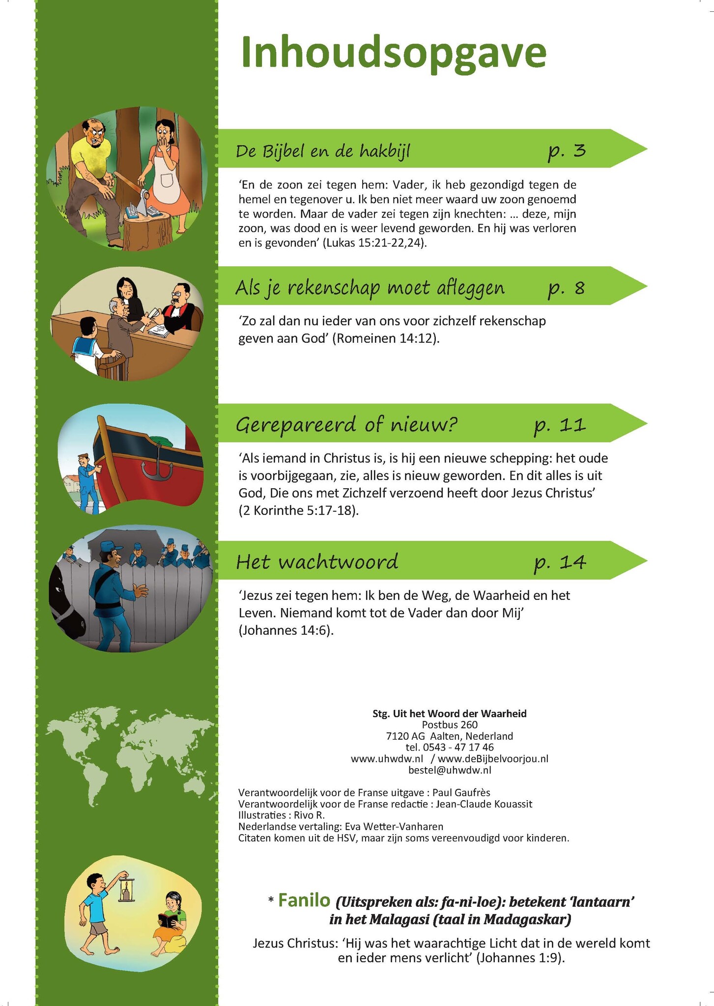 Deze fraai vormgegeven brochure is uitermate geschikt om in het evangelie door te geven aan kinderen, ook in een multiculturele omgeving. De serie ‘Fanilo’ is ontworpen in Madagaskar en geeft in verhalende vorm het goede nieuws van redding door Jezus Christus op een begrijpelijke manier door aan kinderen. Met kleurplaten en Bijbelteksten om evt. uit het hoofd te leren.
