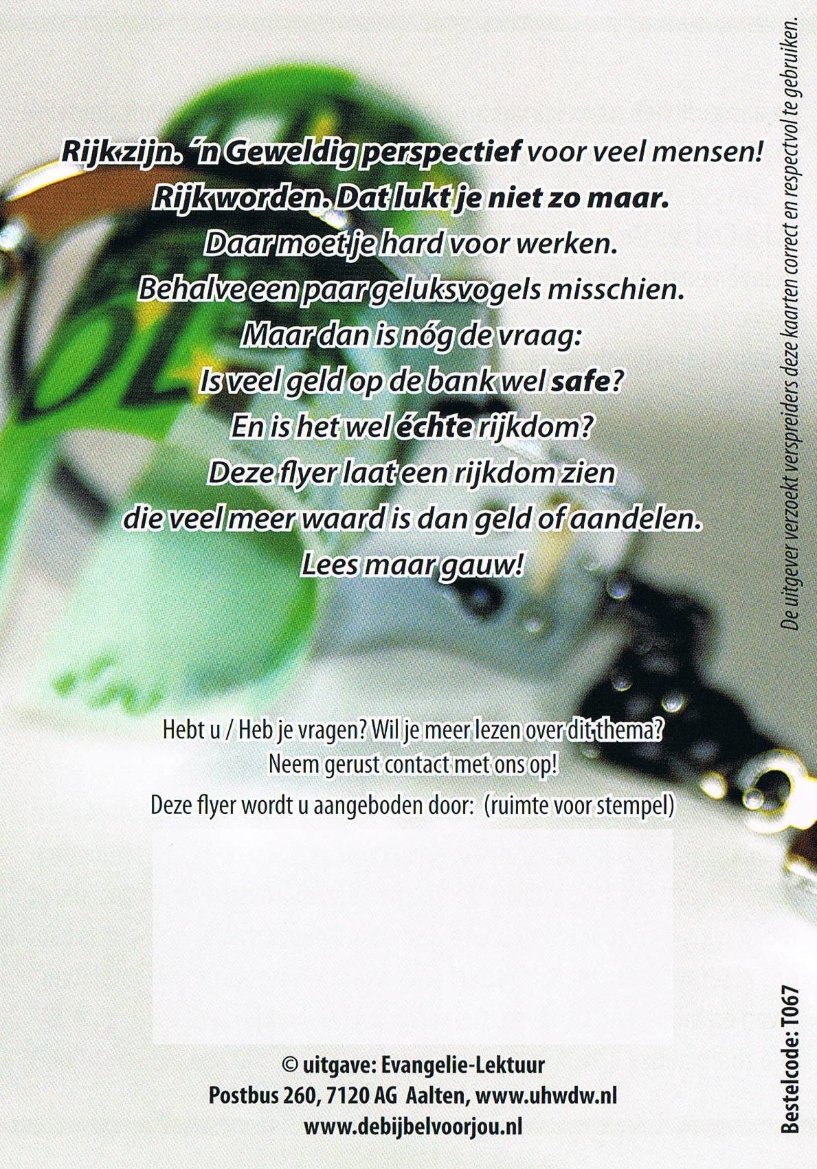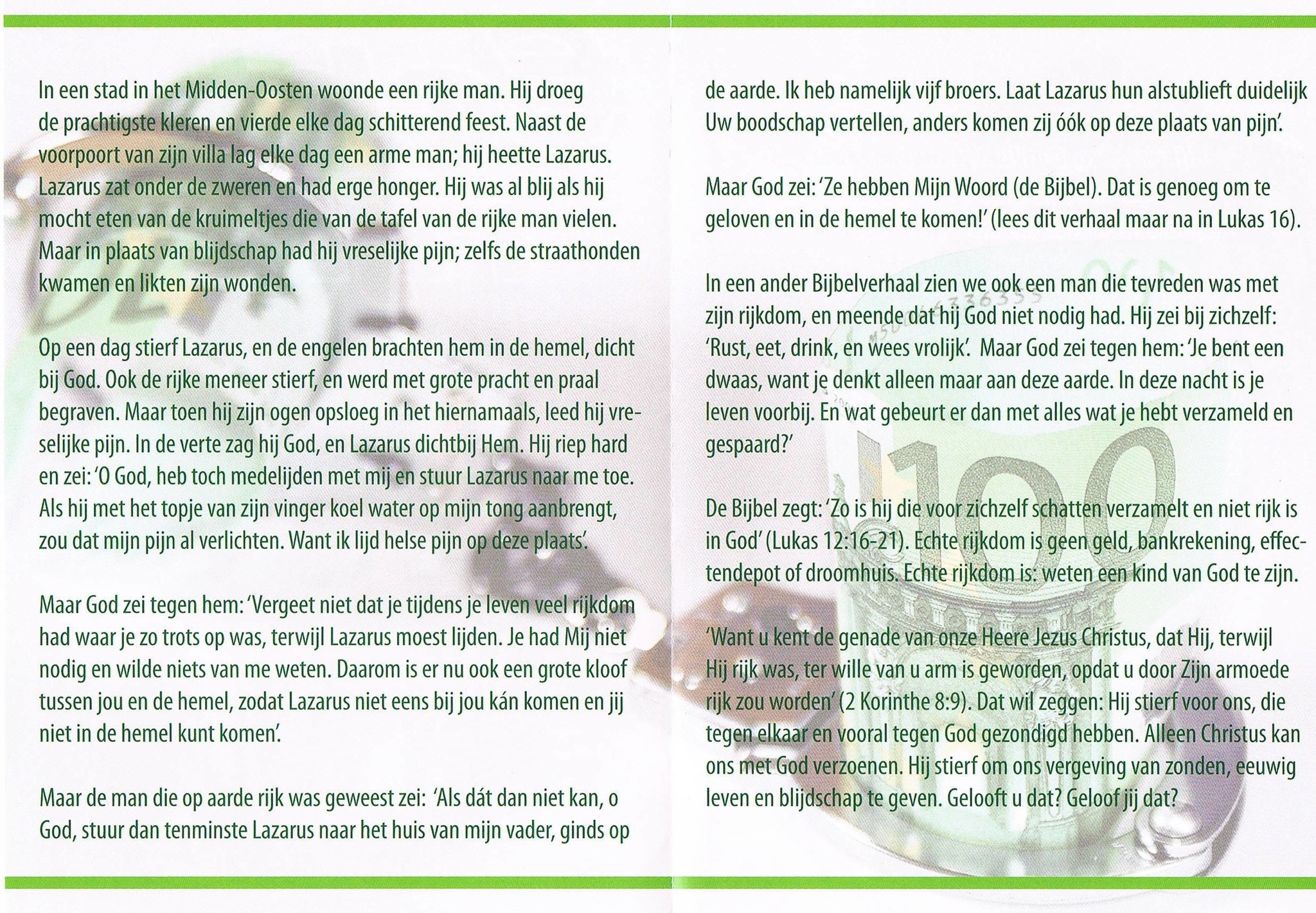 Een goed uitgevoerde folder met het verhaal van de rijke man en de arme Lazarus, met een toepassing voor iedereen die niet rijk is in God.