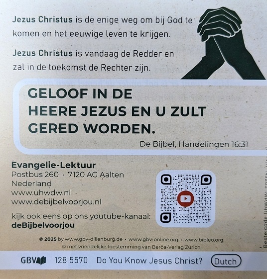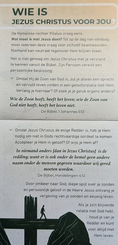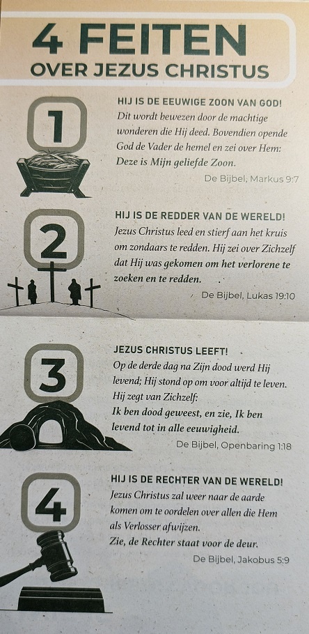 Het vertelt ons op 3 pagina's, ondersteund door Bijbelteksten, Wie Jezus Christus is en dat Hij de enige weg is om bij God te kunnen komen.