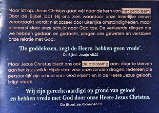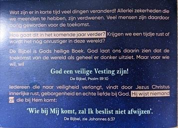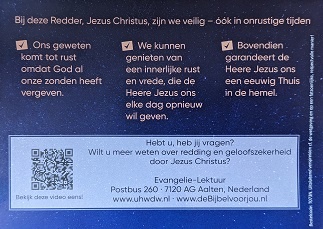 Deze mooie warme flyer wil mensen wijzen naar de enige manier om in deze onzekere en onrustige tijden ware vrede te vinden. Slechts bij onze Redder, Jezus Christus, zijn we veilig - óók in onrustige tijden!