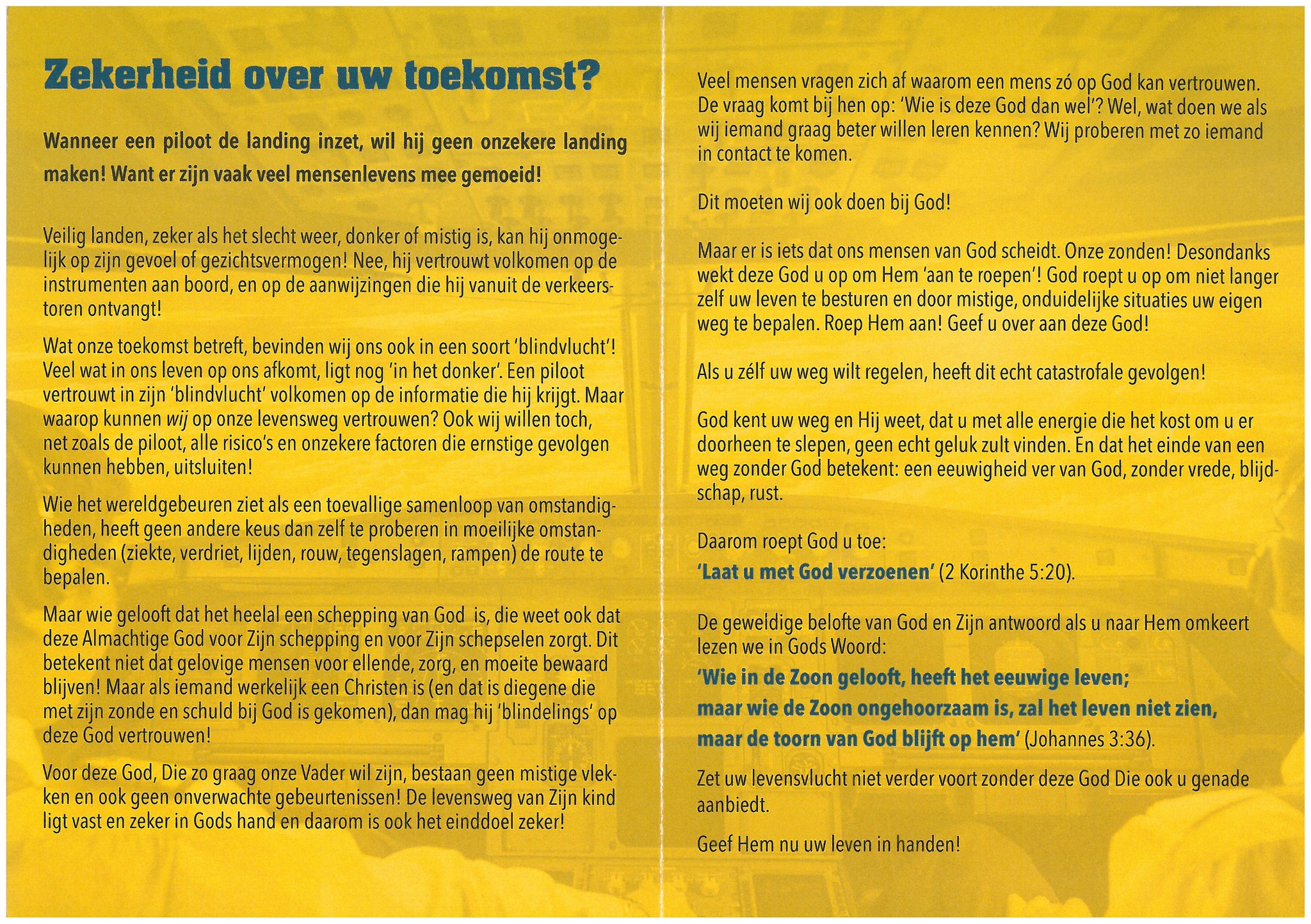Een piloot vertrouwt 'blindelings' op de instrumenten en de instructies van de verkeerstoren. Wie zich tot God bekeerd en de Heere Jezus als zijn of haar Verlosser aanneemt kan 'blindelings' op God vertrouwen. Ook voor het jaar dat voor ons ligt.